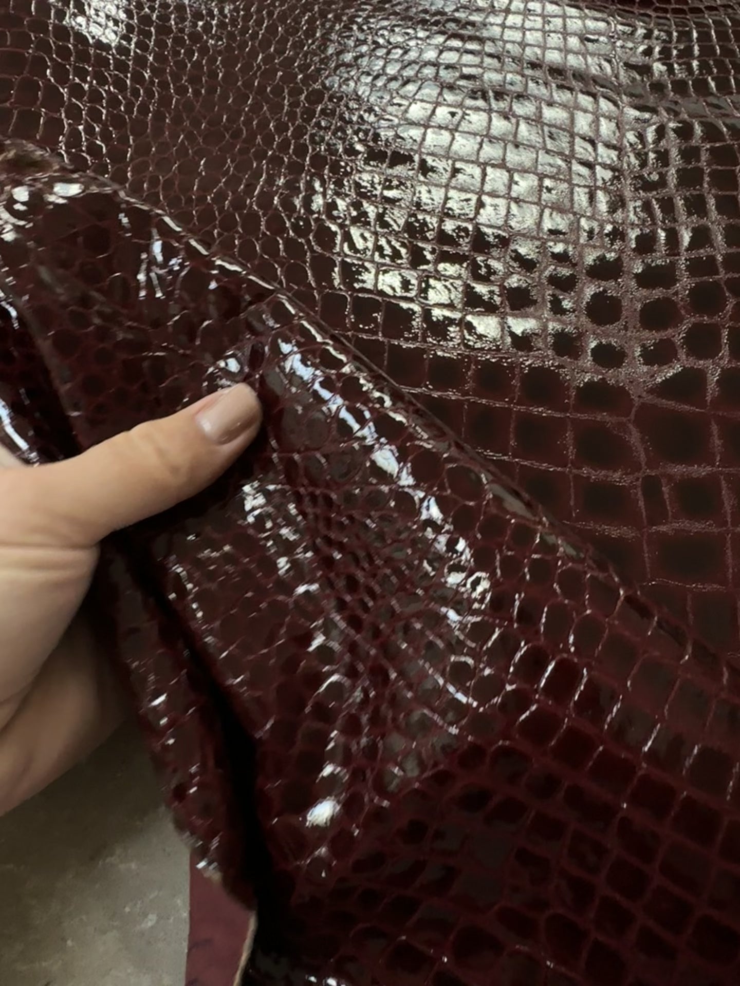 Gorgeous, full-grain Italian croc embossed lambskin hide (full hide) in a rich burgundy patent leather finish. Our lambskin is incredibly supple, buttery soft and elegant. 100% lambskin leather.