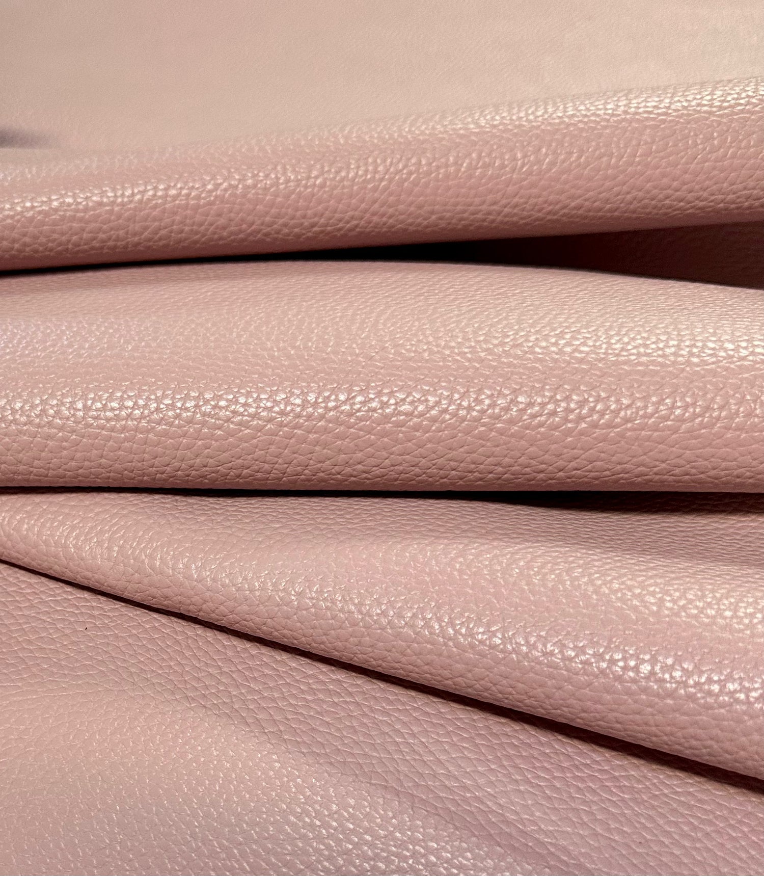 Full-grain, top grade Italian leather with a delicate pebbled printed grain in light antique rose color. It has a soft to medium, yet supple temper, providing the perfect combination of structure and softness. It has been split to 1 mm (2.5 oz) and doesn't need to be skived.